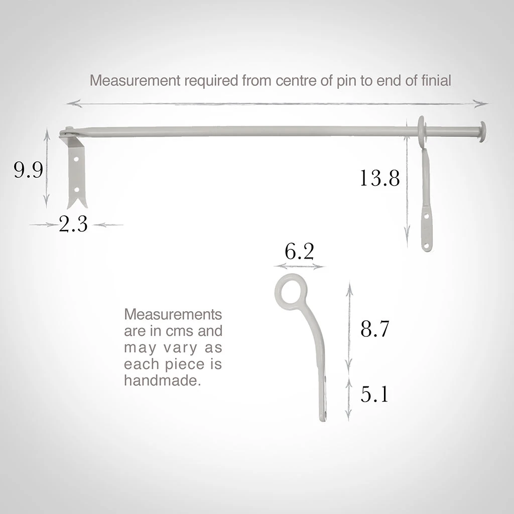 - To ensure your portiere is the correct length, we require the length from the tip of the finial to the centre of the hinge (The hinge is 2cm wide). For help with choosing and measuring your portiere, please read our handy Guide to Portieres in the Jim Lawrence Knowledge Base.