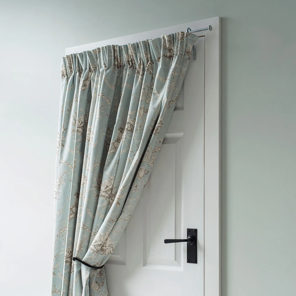 This button ended portiere is designed to open and close with the door. We make the portieres to measure and need the total length of the portiere, from the tip of the finial to the centre of the hinge. (The hinge is 2cm wide). See our guide page to help you in choosing and measuring Portiere rods.