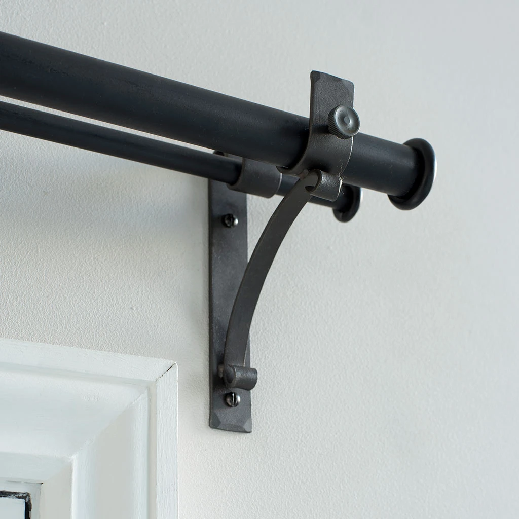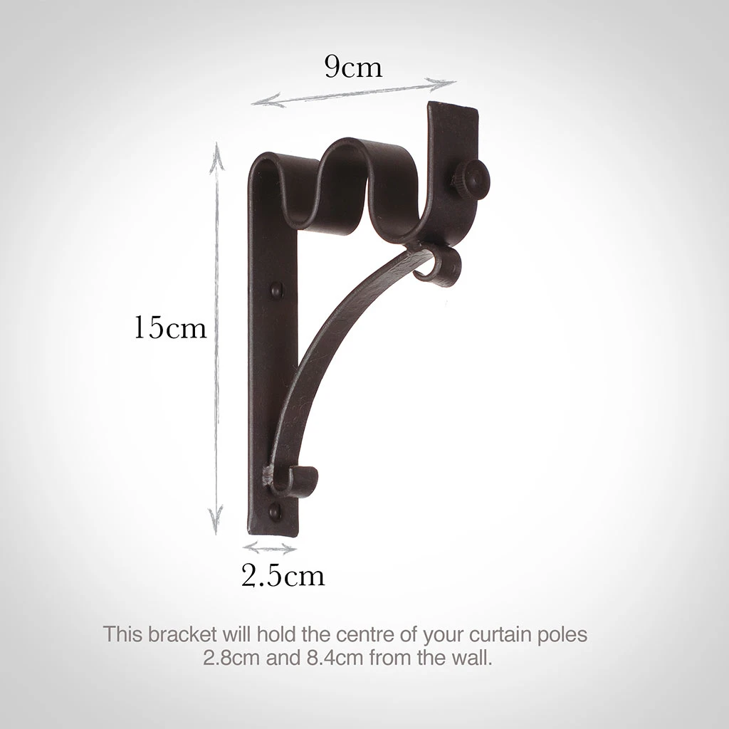 This bracket is finished in traditional black Beeswax for a lovely soft, wrought iron look. We also make a wide range of complementary finials, rings and curtain holdbacks for you to choose from. The brackets have a decorative thumbscrew at the front to help secure your pole, and chamfered edges for an elegant finish.