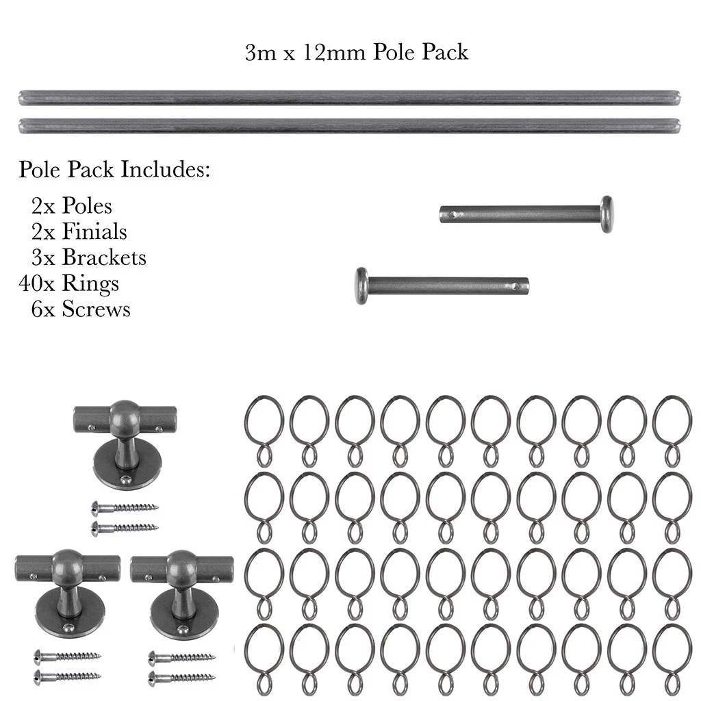 Complete your curtain designs with our ready-made 3m, 12mm Button Pole Pack in our gunmetal grey, Polished Lacquer finish, for a contemporary look to your window. The packs are designed as an elegant, yet quick and easy alternative to our classic range of poles.