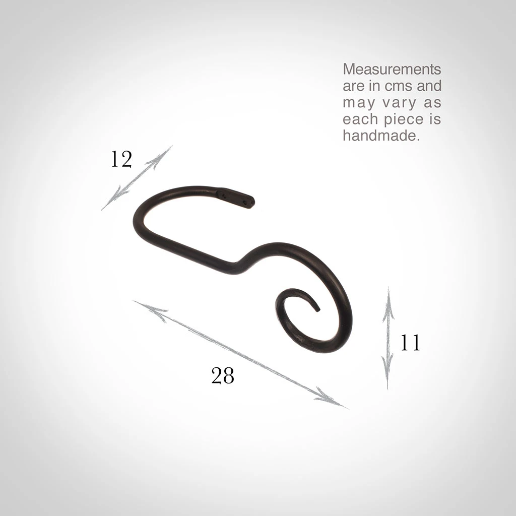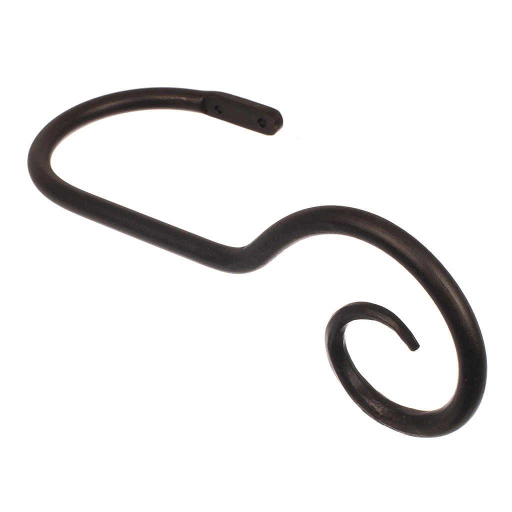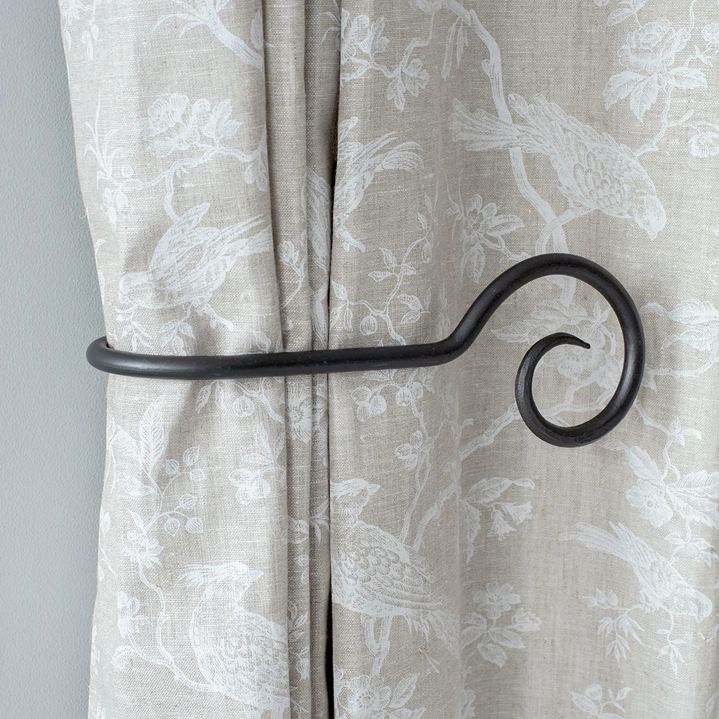 This monkey tail style holdback is hand forged and available in a choice of finishes to match your pole. We make the holdback in two sizes: unless your curtain is very light or has no more than a width of fabric we generally recommend this larger size.