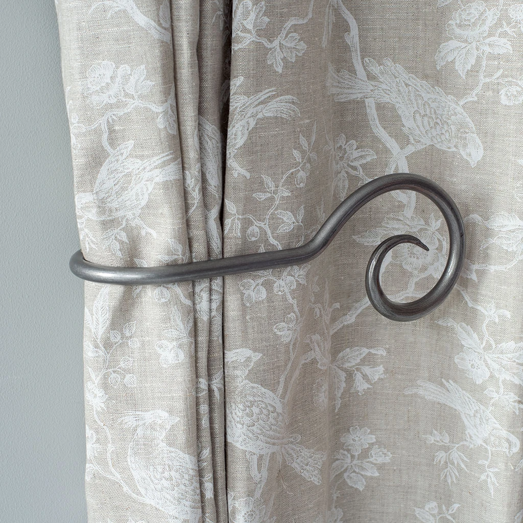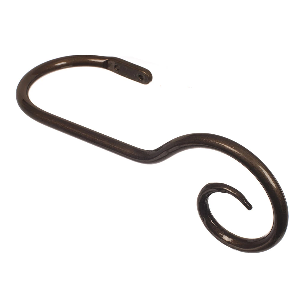 This monkey tail style holdback is hand forged and available in a choice of finishes to match your pole. We make the holdback in two sizes: unless your curtain is very light or has no more than a width of fabric we generally recommend this larger size.
