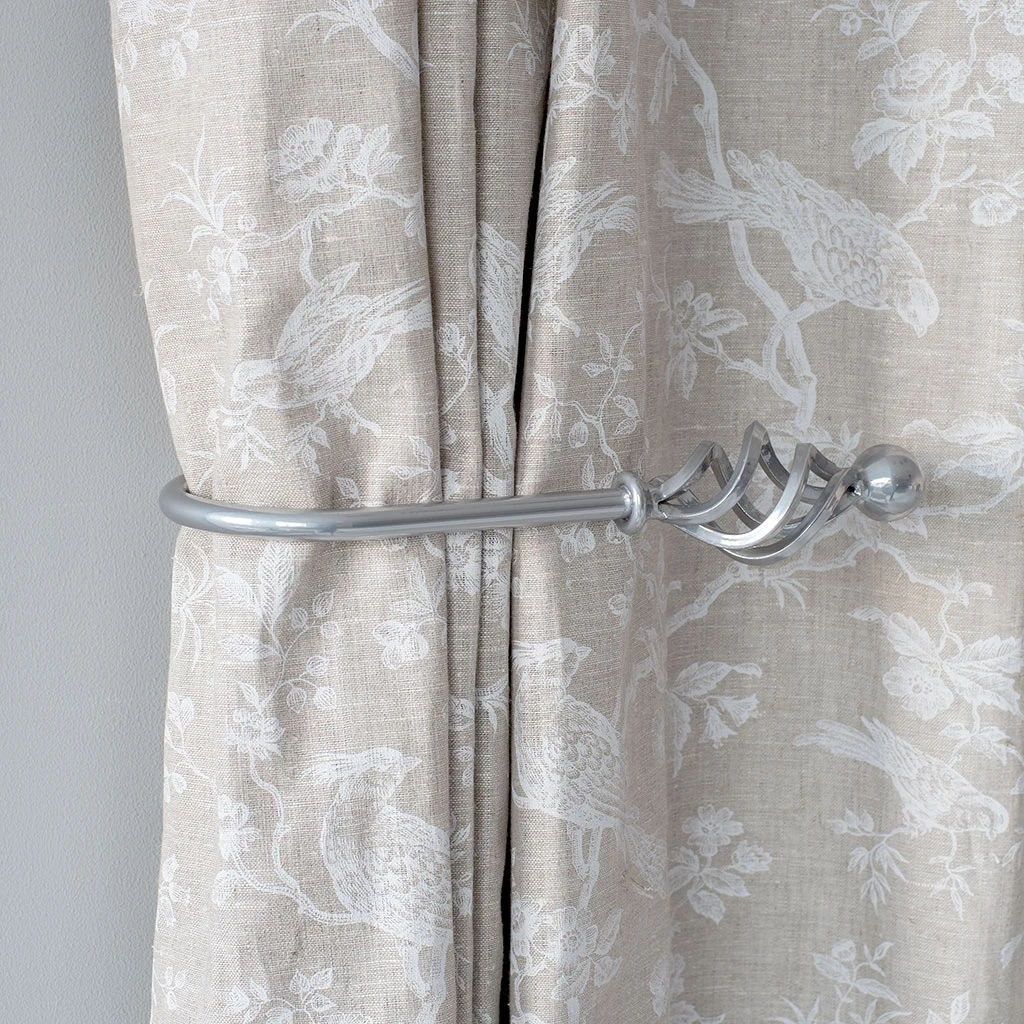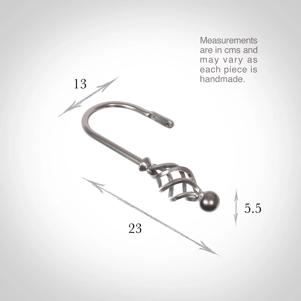 A hand forged, solid steel holdback to match our Cage & Ball finial. The holdbacks are available in two sizes: this larger size is generally recommended where there is more than one width of fabric in the curtain (unless it is a very light, unlined fabric).