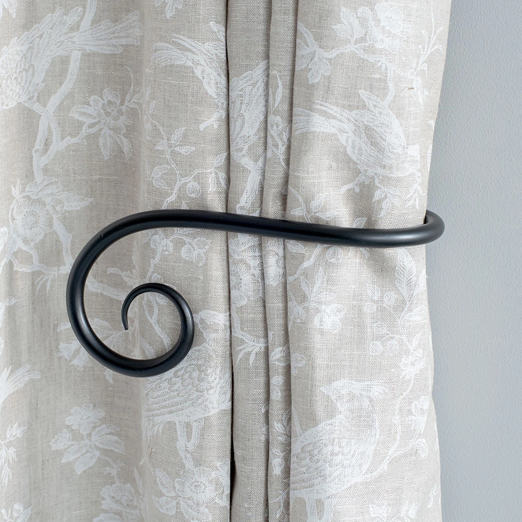 A hand forged, solid steel holdback to match our Crook finial. The holdbacks are available in two sizes: this larger holdback is generally recommended where there is more than one width of fabric in the curtain (unless it is a very light, unlined fabric).
