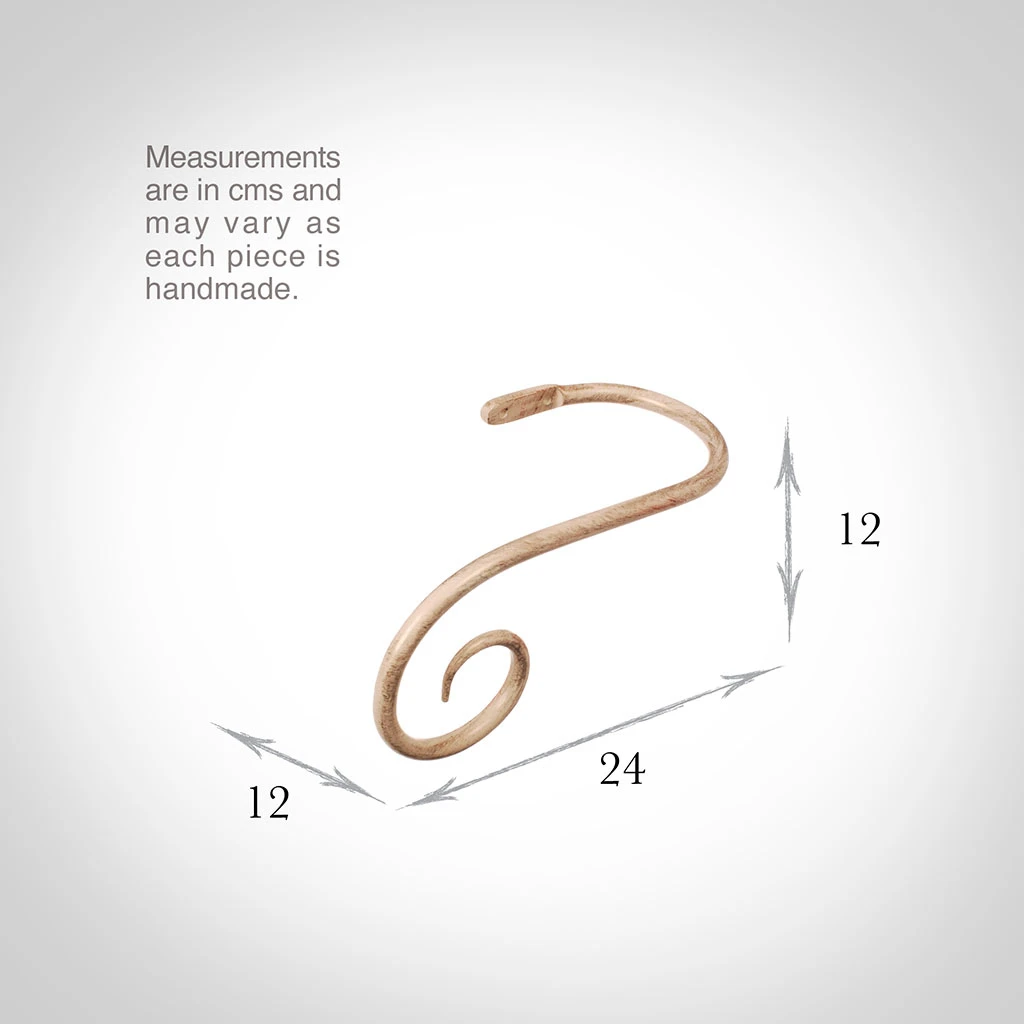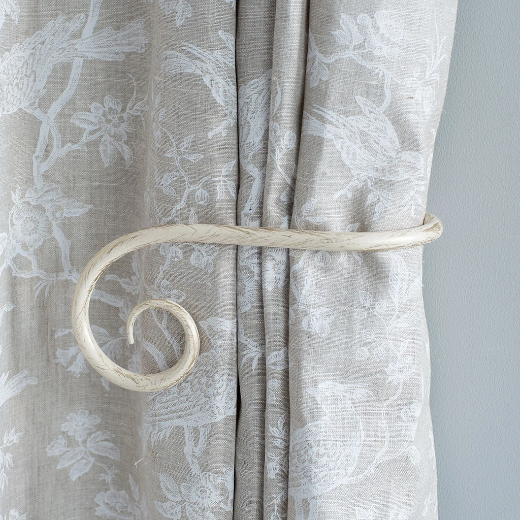 A hand forged, solid steel holdback to match our Crook finial. The holdbacks are available in two sizes: this larger holdback is generally recommended where there is more than one width of fabric in the curtain (unless it is a very light, unlined fabric).