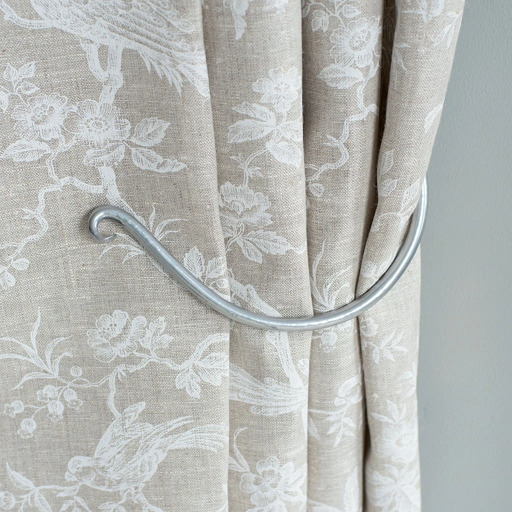 A hand forged holdback which hangs flat against the wall when not in use. The Swing Holdback is available in two sizes (large and small) and a choice of finishes.
