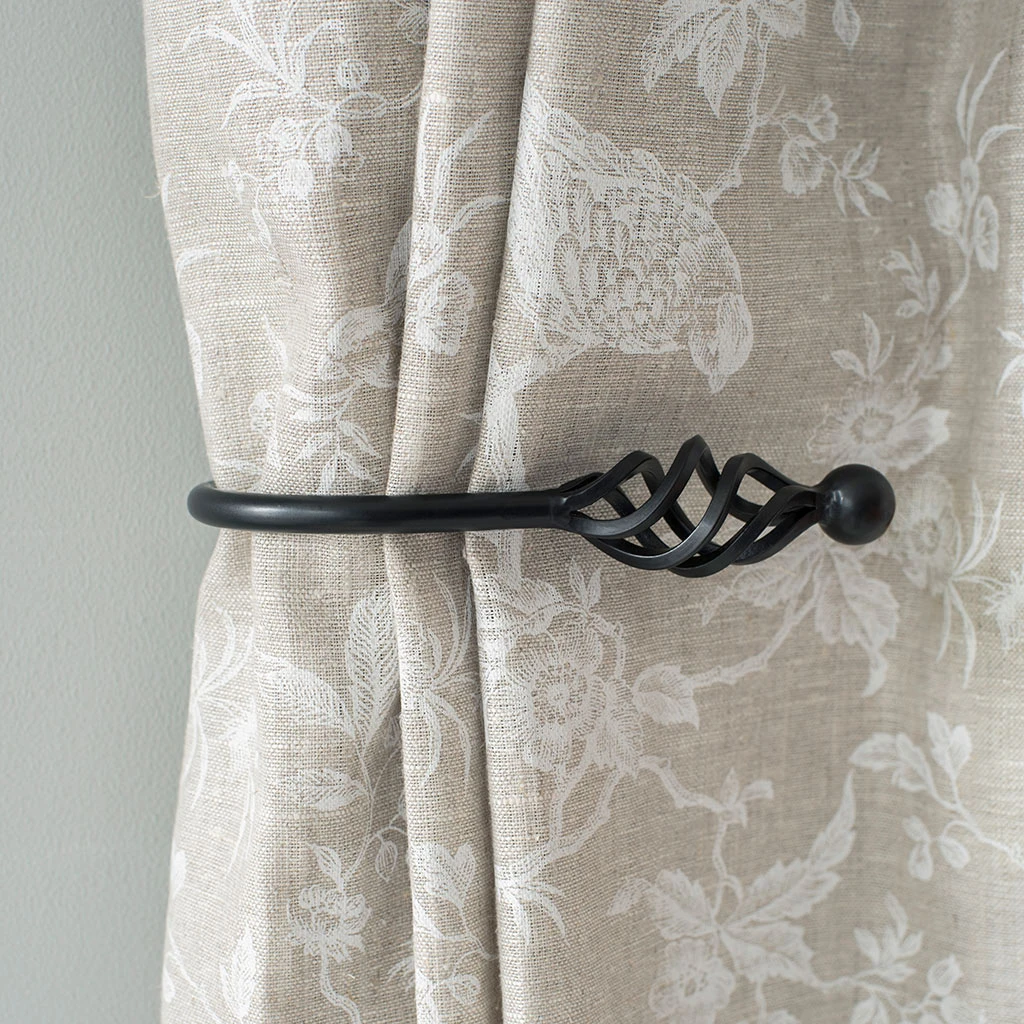 A hand forged, solid steel holdback to match our Cage & Ball finial. The holdbacks are available in two sizes: this smaller holdback is generally recommended where there is only one width of fabric in the curtain (or more if it is a very light, unlined fabric).