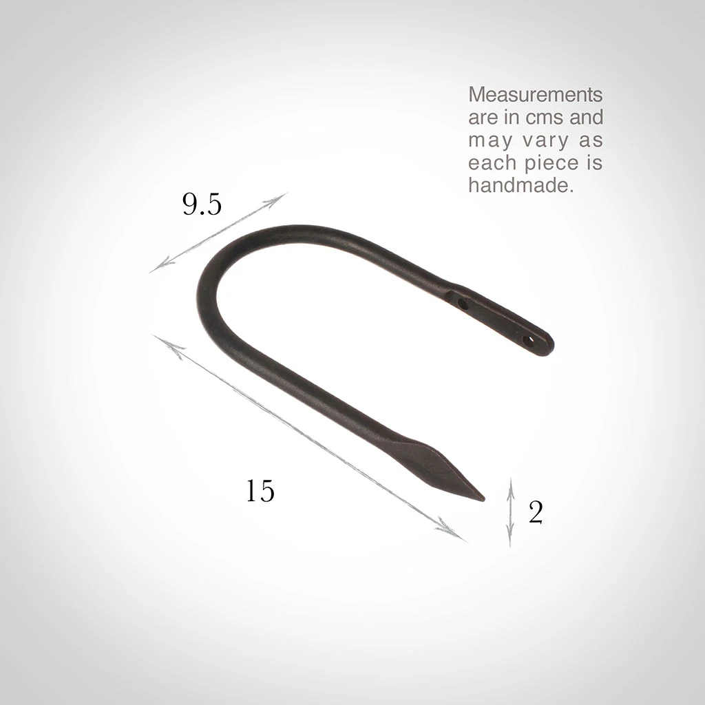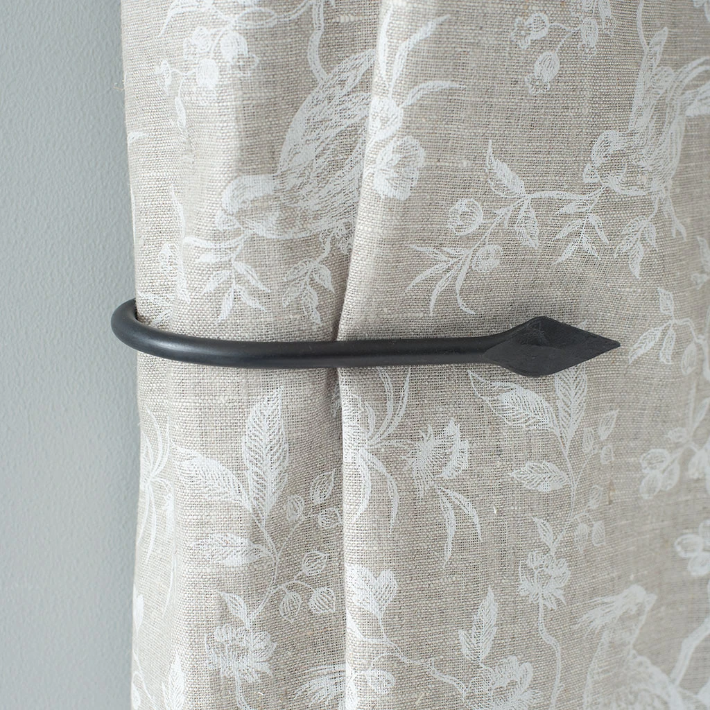 A hand forged, solid steel holdback to match our Spear finial. The holdbacks are available in two sizes: this smaller size is generally recommended where there is only one width of fabric in the curtain (or more if it is a very light, unlined fabric).