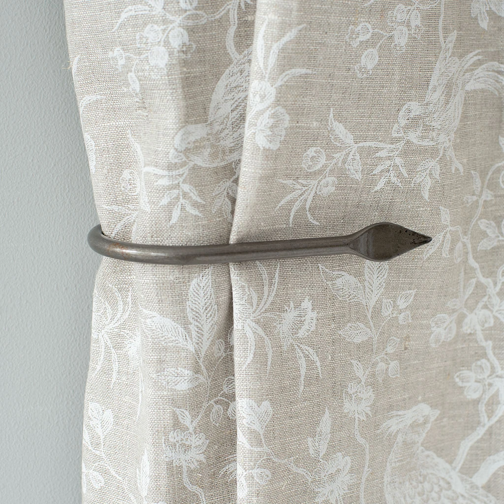 A hand forged, solid steel holdback to match our Spear finial. The holdbacks are available in two sizes: this smaller size is generally recommended where there is only one width of fabric in the curtain (or more if it is a very light, unlined fabric).