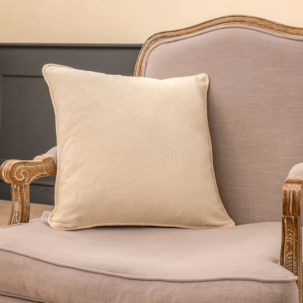 Our Waterford Linen is a beautifully soft, tactile fabric in a selection of dusky tones that lend themselves beautifully to soft furnishings, creating elegant neutral shades for your home. Shown above in our gorgeous new Cream colourway, this cushion cover is a sumptuous cream square with a clean, piped seam, that will catch your eye wherever it sits.